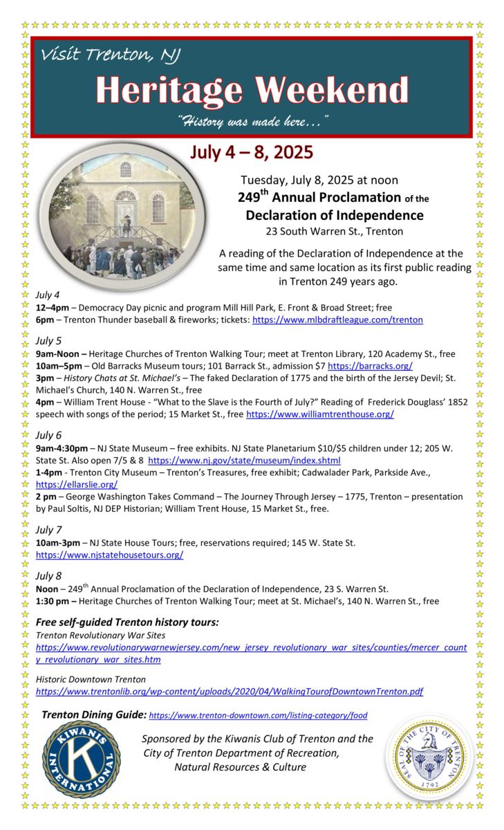 The Kiwanis Club of Trenton is proud to partner with the City of Trenton and the community to present "Heritage Weekend -- History was made here" celebrating Trenton's rich history and diversity, July 4 - 8, 2025. All are welcome to join us for five days full of fascinating programs, inspiring celebrations and, of course, great food! Heritage Weekend culminates with the 249th annual Proclamation of the Declaration of Independence on Tuesday July 8, 2025 at noon on Warren Street. The reenactment is at the same location and time as the first reading of the Declaration in Trenton in 1776. The full Heritage Weekend calendar is below.